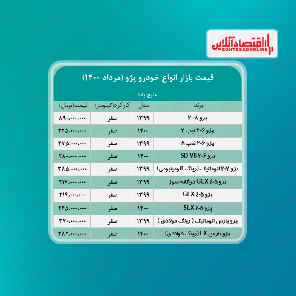 قیمت انواع پژو در بازار/ ٢٠۶ تیپ ٢ به ٢٢۵ میلیون تومان رسید زمان انتشار: 28 جولای 2021 ساعت 17:36 دسته بندی: اقتصاد شناسه خبر: 546120 زمان مطالعه: 1 دقیقه در جدول زیر قیمت انواع پژو در بازار آزاد را مشاهده میکنید. ٢٢٣٢٢٣