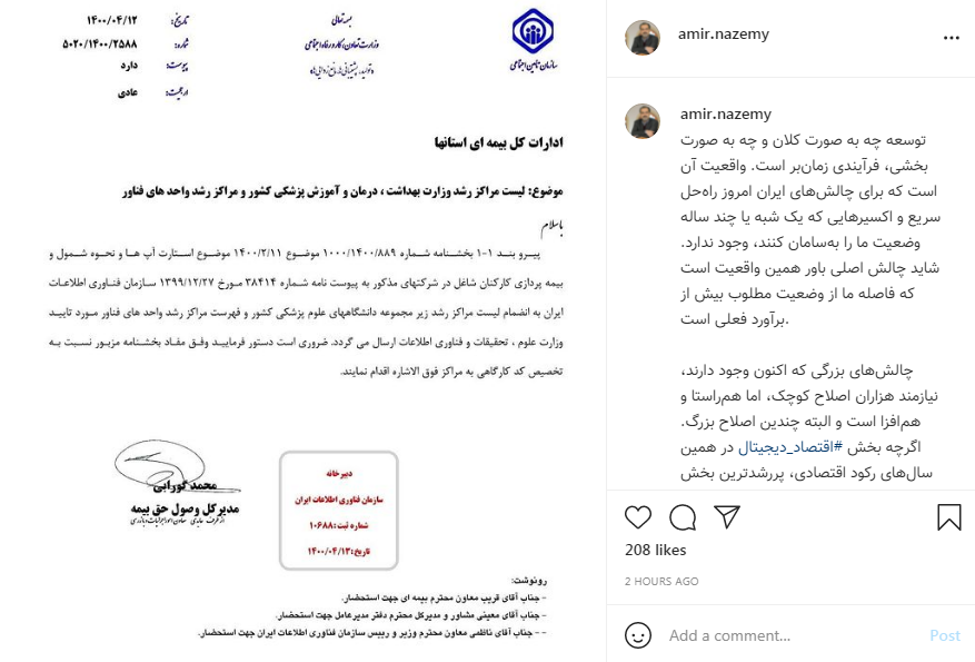 رییس سازمان فناوری اطلاعات خبر از صدور بخشنامهای از سوی سازمان تامین اجتماعی به ادارات کل بیمهای استانها داده که بر اساس آن استارتاپها و تیمهای دانش بنیان که در محل کار اشتراکی و شتابدهندهها و همچنین مراکز فعالیت دارند، زین پس یک کد کارگاه اختصاصی خواهند داشت. این اقدام میتواند منجر به فعالیتهای زیادی از سوی این تیمها به صورت مستقل بشود؛ اقداماتی نظیر دریافت وام و یا رد کردن بیمه برای کارمندان خود و دیگر موارد که به رشد تیمها کمک خواهند کرد.