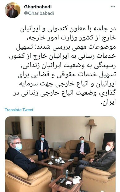 به گزارش سیلاد، کاظم غریب آبادی، معاون امور بینالملل قوه قضائیه و دبیر ستاد حقوق بشر جمهوری اسلامی ایران با انتشار توییتی در این رابطه نوشت: در جلسه با معاون کنسولی و ایرانیان خارج از کشور وزارت امور خارجه، موضوعات مهمی بررسی شدند: تسهیل خدمات رسانی به ایرانیان خارج از کشور، رسیدگی به وضعیت ایرانیان زندانی، تسهیل خدمات حقوقی و قضائی برای ایرانیان و اتباع خارجی جهت سرمایه گذاری، وضعیت اتباع خارجی زندانی در ایران.