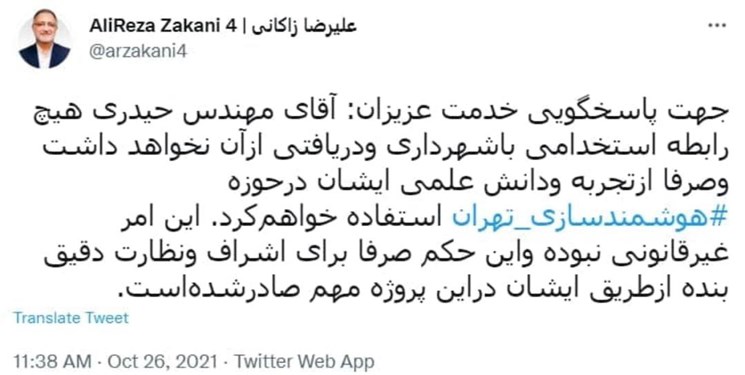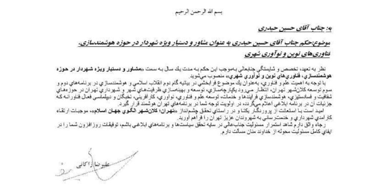 از سوی دیگر یکی از نزدیکان شهردار تهران در خصوص این انتصاب به خبرنگار سیلاد گفت: شهردار تهران به دلیل اینکه دامادش برای کمک در بخش فناوری در برخی جلسات حضور داشته و مشورت هایی به زاکانی میداده است تصمیم گرفت برای جلوگیری از هرگونه شائبه و شفاف شدن حضور دامادش در جلسات این حکم را صادر کند.