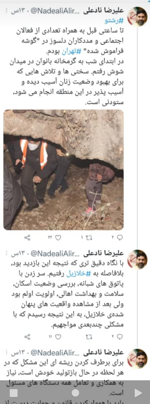 به گزارش خبرنگار شهری سیلاد، علیرضا نادعلی عضو شورای شهر تهران با اشاره به حضور شب گذشته اش در گرمخانه بانوان شوش و حاشیه شهر تهران، در صفحه شخصی خود در توئیتر اظهارداشت:تا ساعتی قبل به همراه تعدادی از فعالان اجتماعی و مددکاران دلسوز در گوشه فراموش شده تهران بودم.