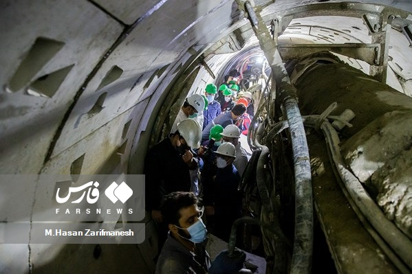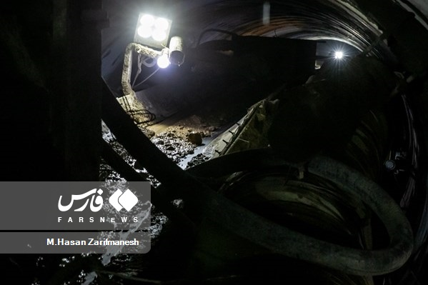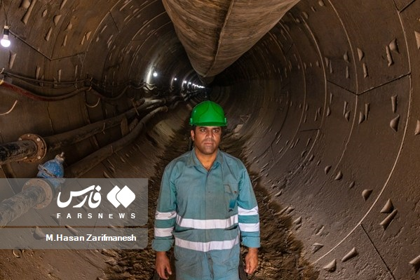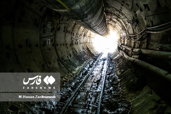 نورضعیف لامپها فضای تونل را مخوف میکند. حرکت آب، گلولای در کف تونل مشهود است. هر چه به جبهه کار نزدیکتر میشویم بوی نم و نای خاک بیشتر میشود. شماره اعداد در دیواره بتنی تونل بالاتر میرود حالا به شماره ۷۰۵ رسیدهایم. سیمها و کابلهای برق روی دیواره تونل دستهدسته جمع شدهاند. از همان ابتدای تونل، لوله قطور تهویه روی سقف، همچنان با ما همراه است. خبرهایی که قبلاً درباره حفاری تونل شنیده بودم را مرور میکنم «عباس شعبانی» معاون فنی و عمرانی درباره حفاری این تونل گفته بود: «این تونل بزرگترین تونل غرب تهران در اتوبان فتح است. این تونل به قطر ۴.۳ متر است وحدود ۴۲۰۰ متر طول دارد و تاکنون بیش از ۲۸۰۰ متر از تونل را با دستگاه حفار مکانیزه «تی بی ام» احداث شده است.»