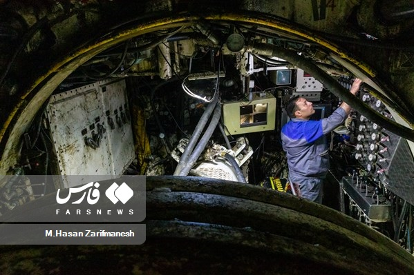 برای رسیدن به محل جبهه کار، از لبه سکویی باریک و آهنی بین دستگاه و دیواره تونل میگذریم. عرض سکو بهقدری است که فقط یک نفر میتواند از آن عبور کند. اپراتوری داخل اتاق فرمان نشسته است. اینجا از بیل و کلنگ خبری نیست با کلیدها به دستگاه دستور میدهند. سر دستگاه مته بزرگ و دایرهواری است که با دیواره تونل مماس شده است و بهصورت مکانیزه تونلی به قطر ۴ مترو نیم را در داخل زمین حفاری میکند و هر جا که دستور پیدا کند مانند ماری با سر بزرگی به قطر ۴ و نیم متر از کف زمین سر بیرون میآورد و این یعنی انتهای تونل. حالا زمین را میتراشد و جلو میرود و بوی نم و خاک بلند شده است.